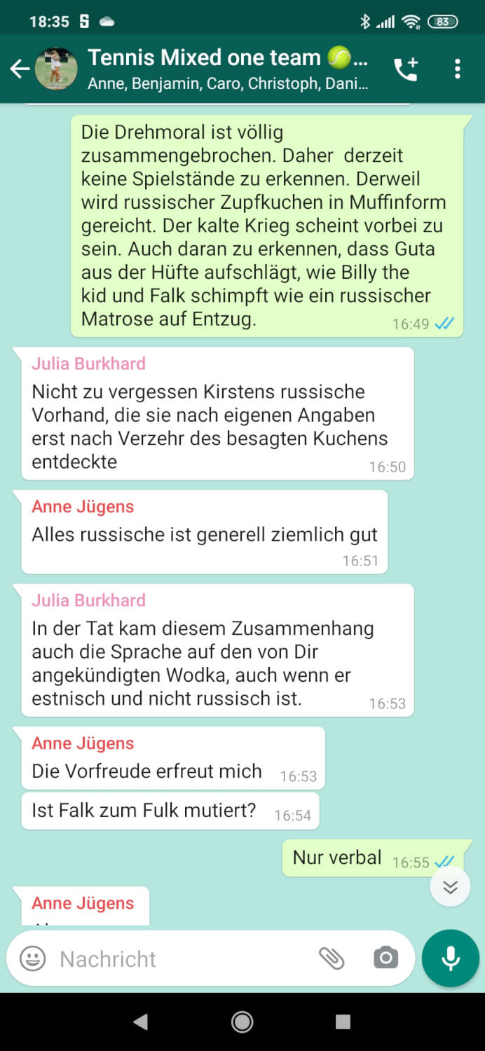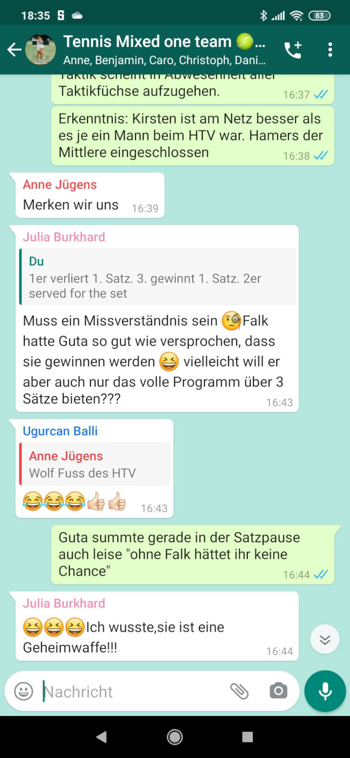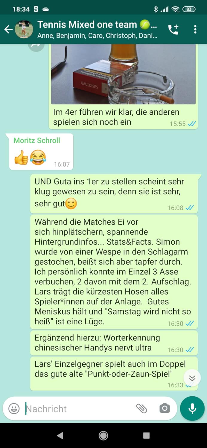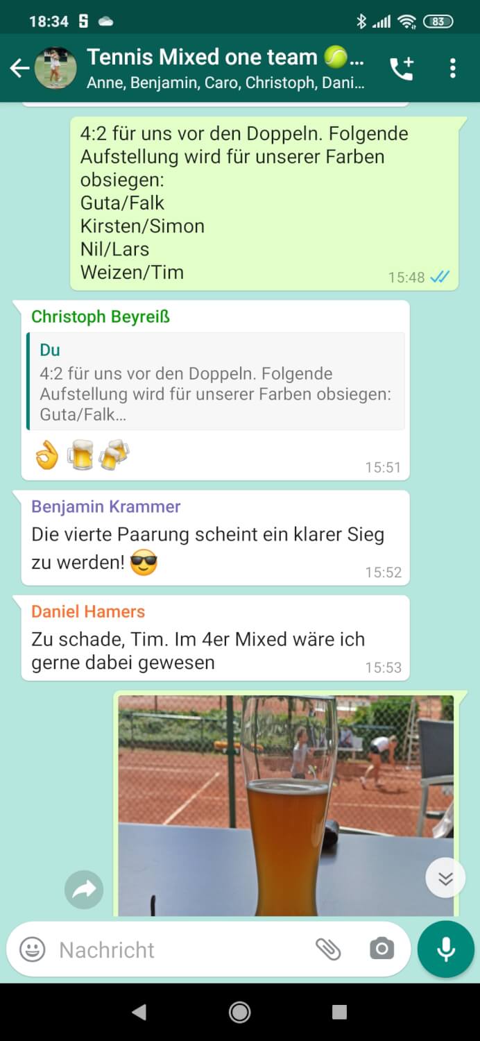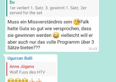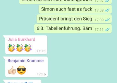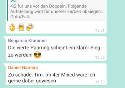 Den Verlauf der Mixed gibt vermutlich am besten der Whatsapp-Liveticker wieder, sodass hier auf weitere textliche Berichterstattung verzichtet werden soll. Gesagt sei aber noch, dass Falk im Ticker ein bisschen schlecht wegkommt, was aber nur an seiner Whatsapp-Verweigerung liegt. Ehrlich gesagt, hat er alles richtig gemacht und äußerst teamorientiert agiert: Zunächst sicher den Einzelpunkt geholt, um sich dann freiwillig ins vermutlich schwierigste Doppel zu stellen, damit hinten sicher gepunktet werden kann.