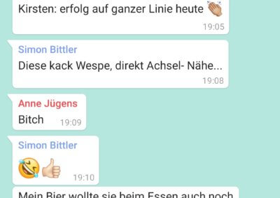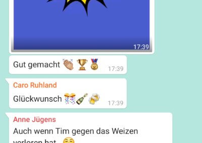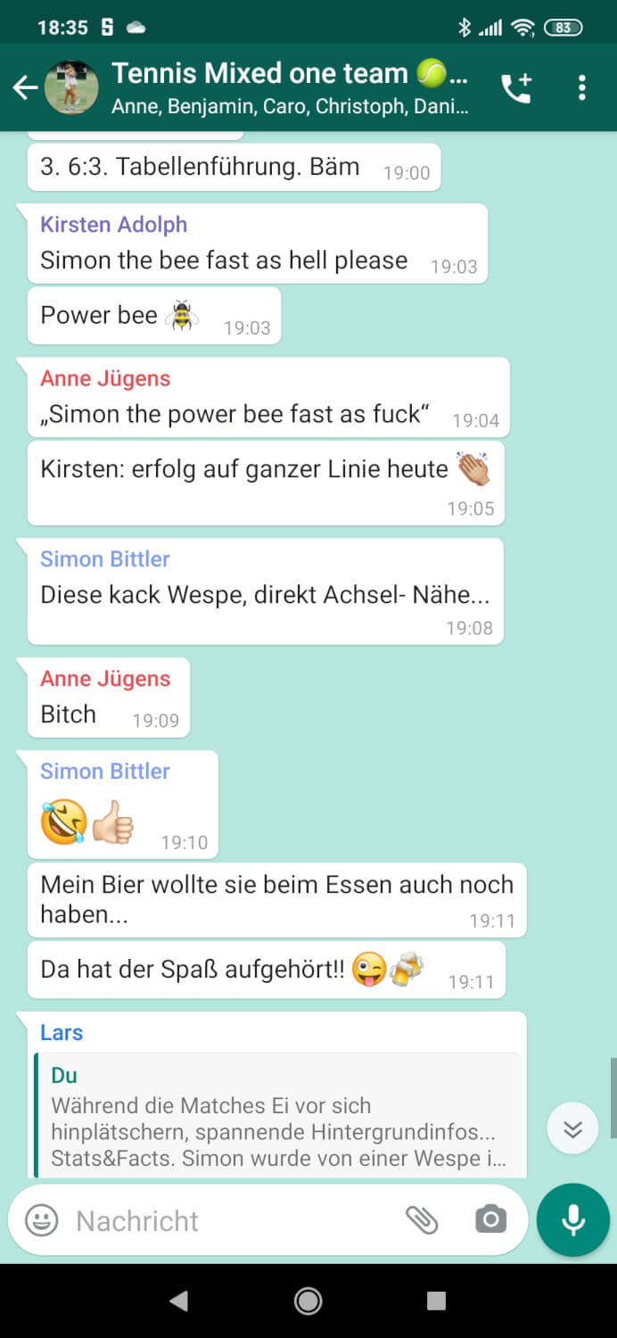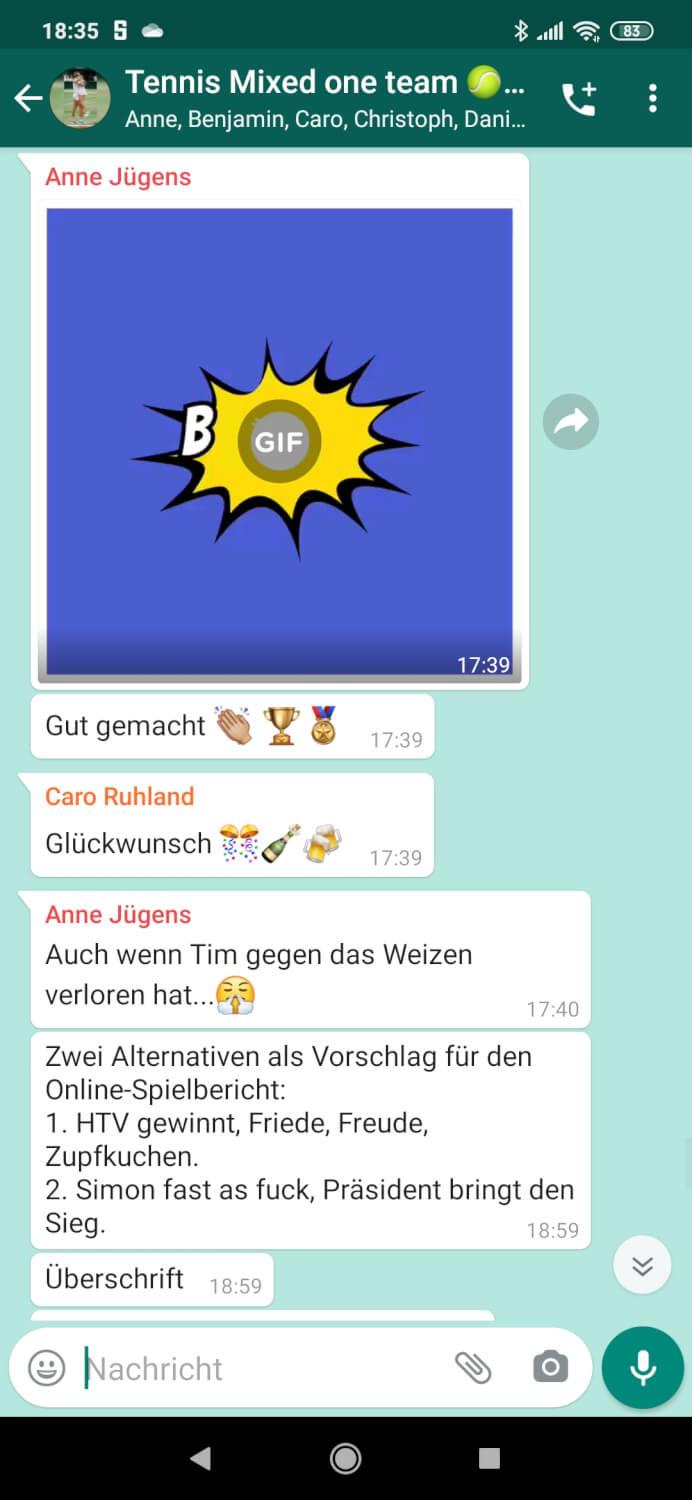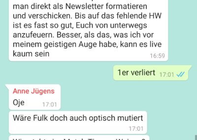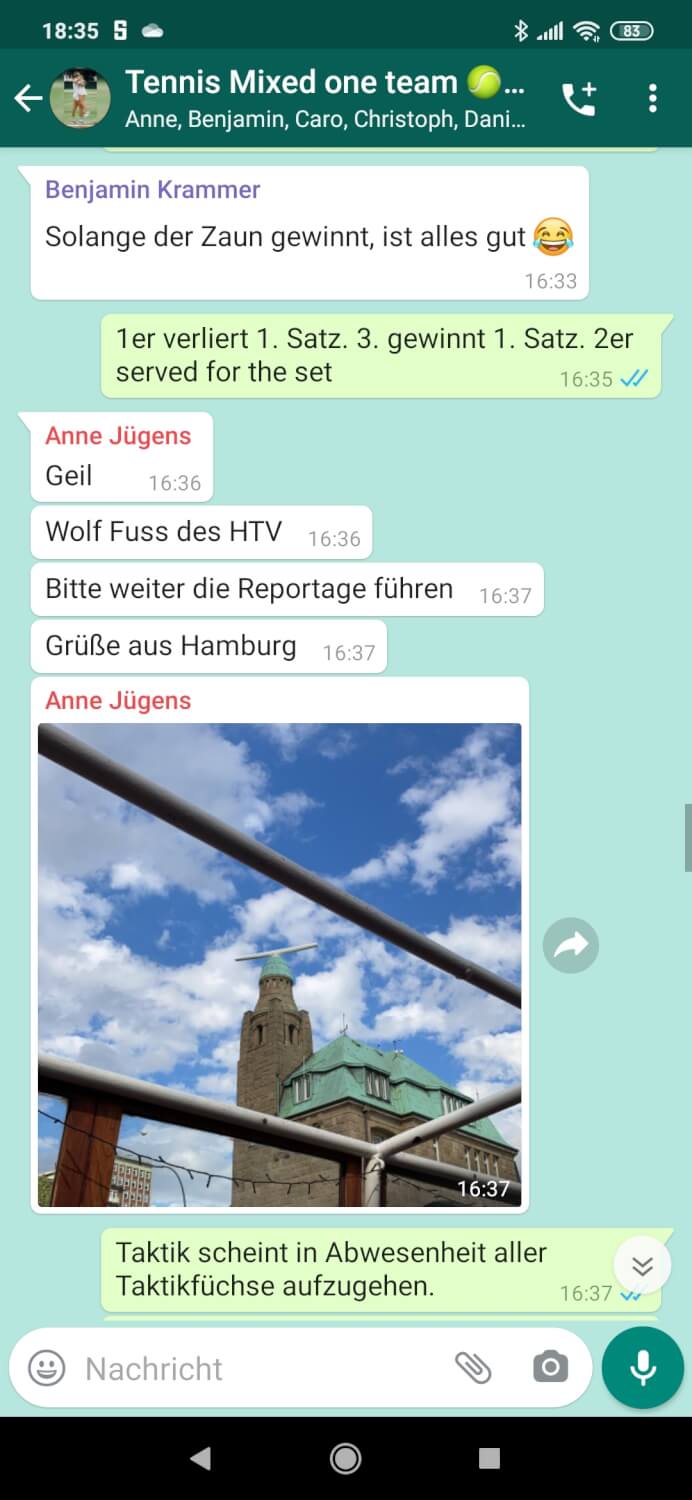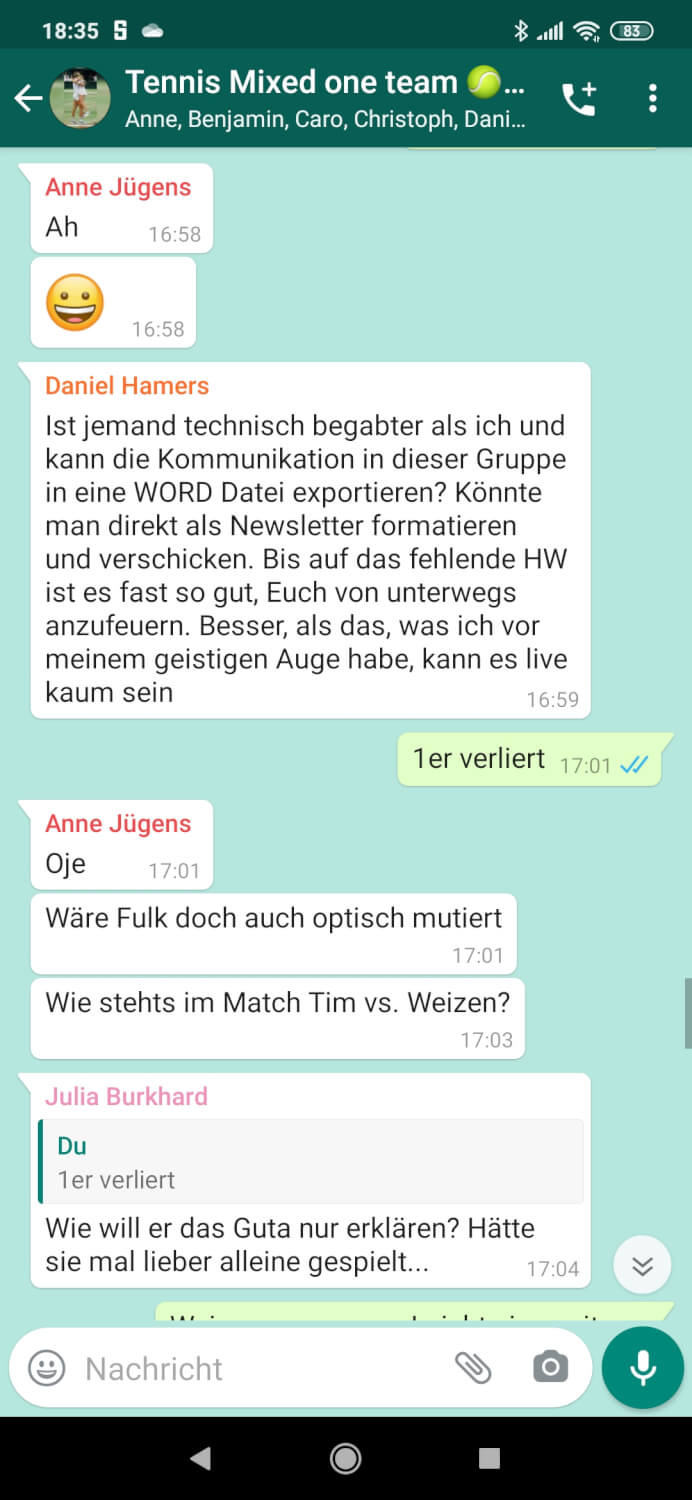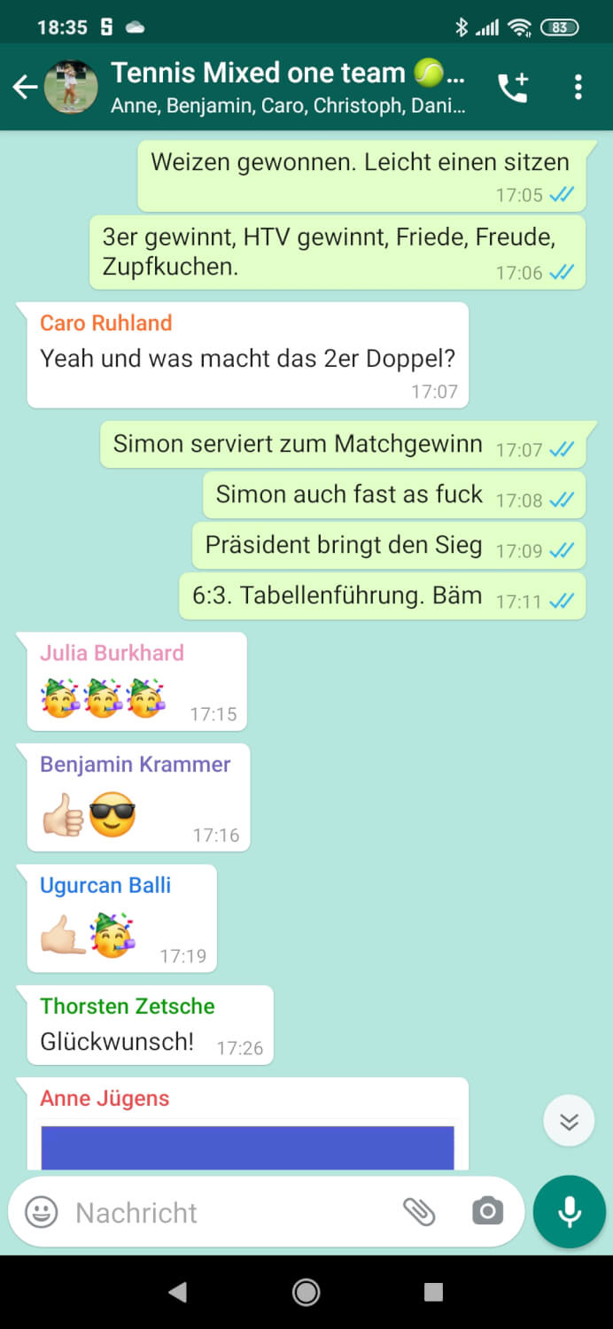 Den Verlauf der Mixed gibt vermutlich am besten der Whatsapp-Liveticker wieder, sodass hier auf weitere textliche Berichterstattung verzichtet werden soll. Gesagt sei aber noch, dass Falk im Ticker ein bisschen schlecht wegkommt, was aber nur an seiner Whatsapp-Verweigerung liegt. Ehrlich gesagt, hat er alles richtig gemacht und äußerst teamorientiert agiert: Zunächst sicher den Einzelpunkt geholt, um sich dann freiwillig ins vermutlich schwierigste Doppel zu stellen, damit hinten sicher gepunktet werden kann.